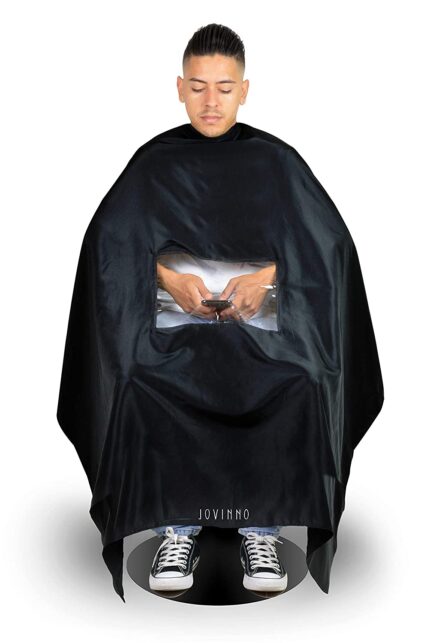Jovinno – Large Size Premium Quality Black Hair Cutting Barber/Salon Window Cape Soft Gown Apron With Mobile Phone Viewing Window, Metal Snap Neck Closure,…